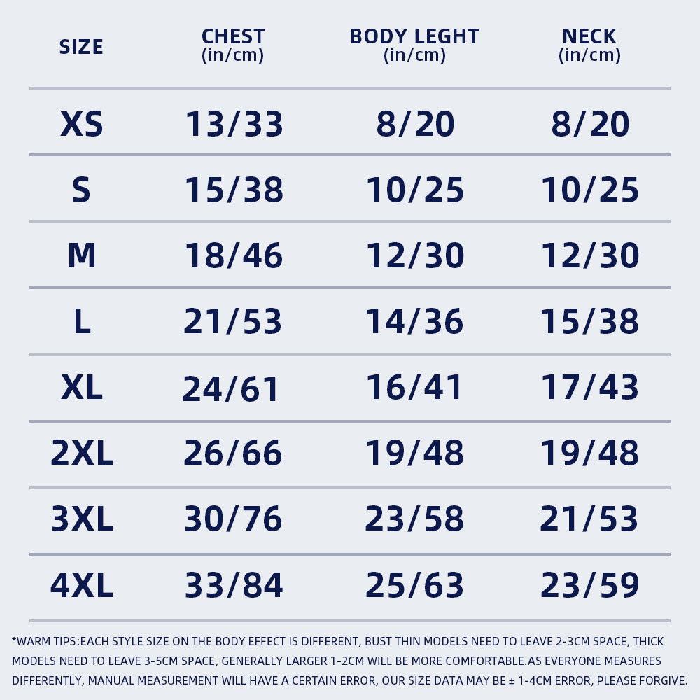 3XL:Chest circumference 76cm / 30in; Back length 58cm / 23 in; Neck circumference 53cm / 21 in;