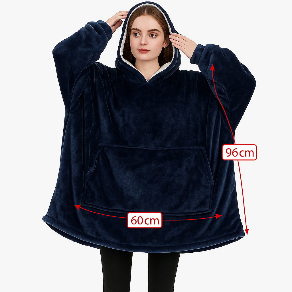 Stay warm hands-free with this USB electric heated hoodie blanket in Blue. The oversized hood and sleeves keep heat in while allowing full movement, and the back heating area provides targeted warmth. Choose from 3 heat levels (low/medium/high) and power it from any 5V/2A USB source such as a compatible power bank or USB adapter (power bank not included). Soft flannel fleece exterior with sherpa-lined hood for cosy comfort. Machine-washable at 30°C once the cable is disconnected.