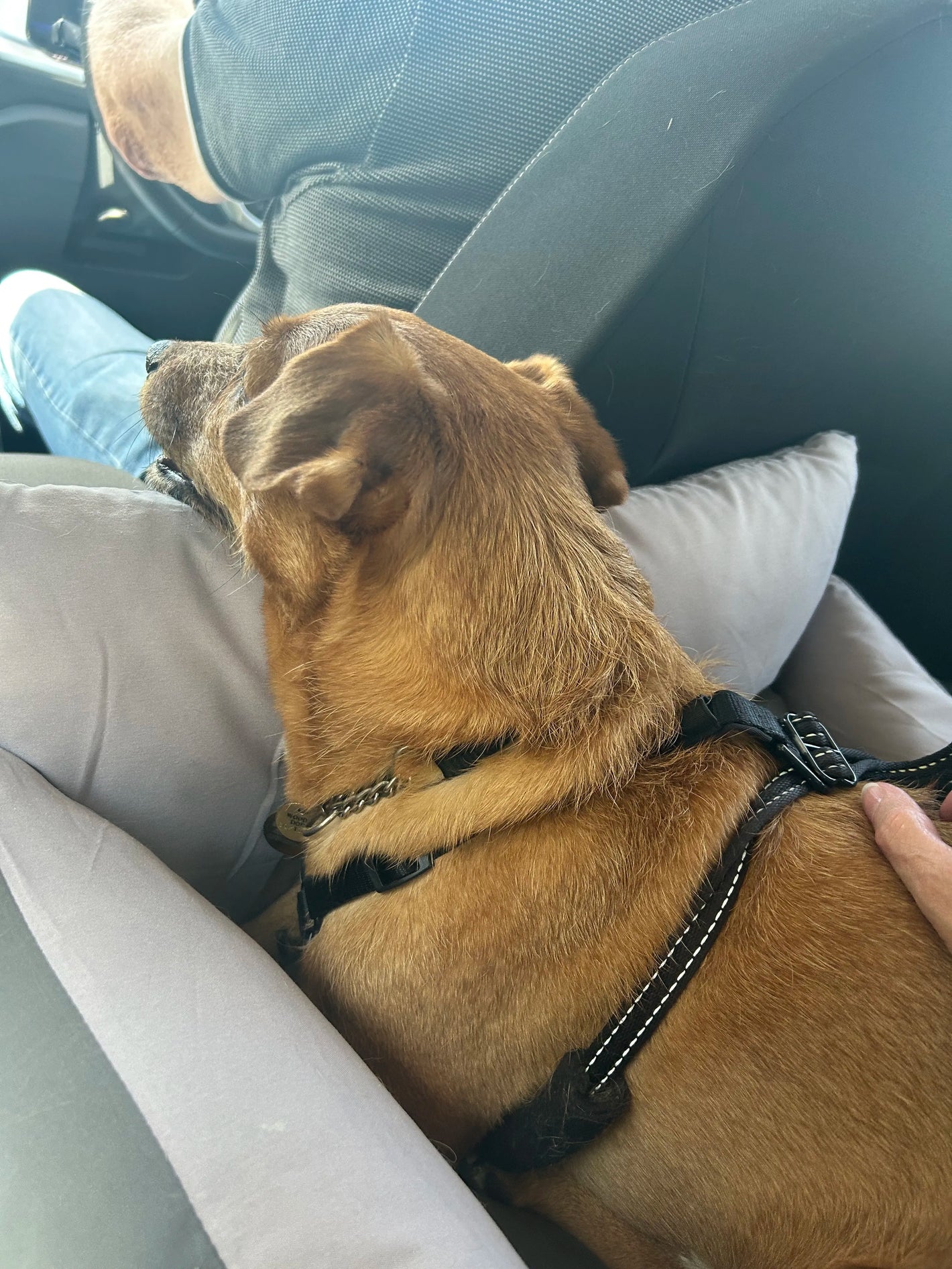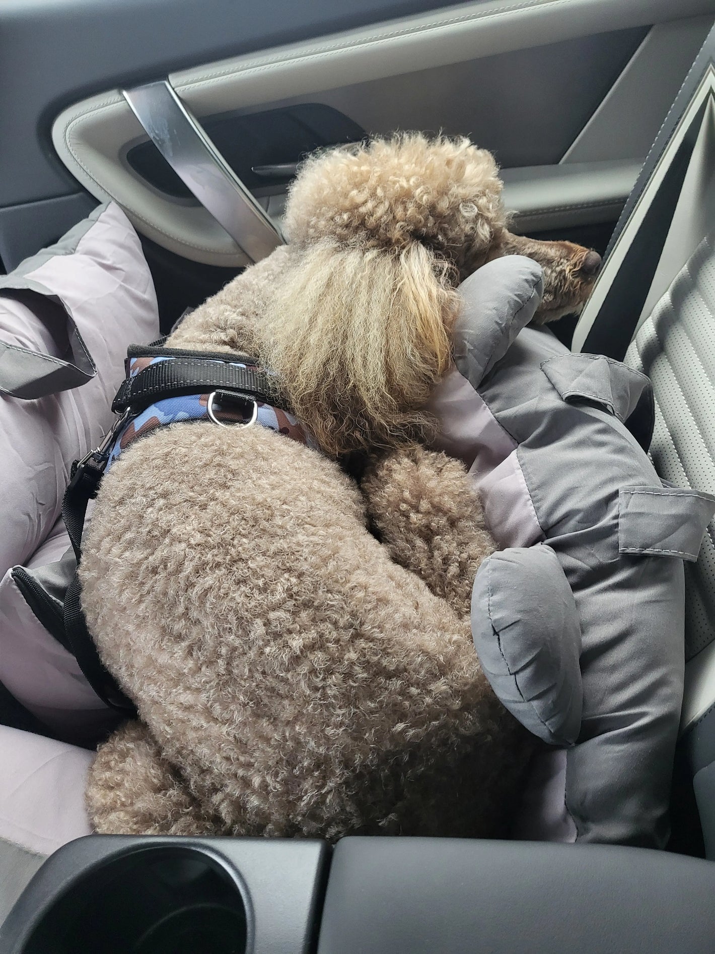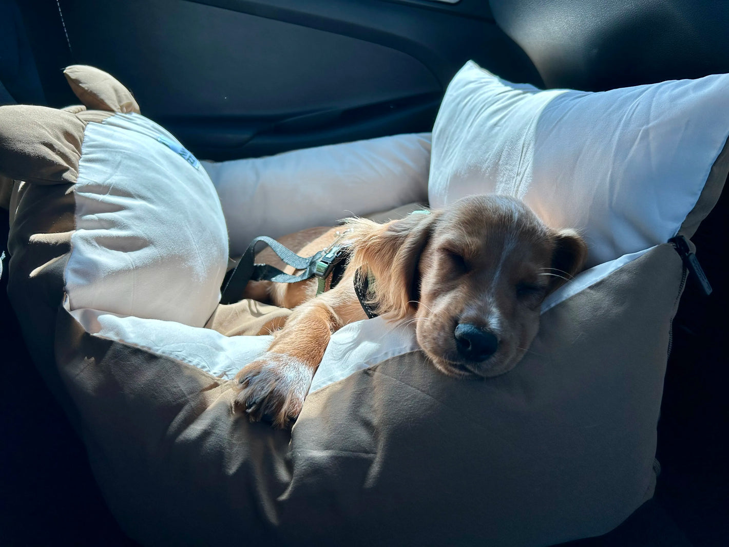 My baby cocker spaniel is more than happy him his safe and secure bear seat. It’s really comfy and I like that it straps in with the seat belt. Only downside is the material may rip if puppy’s sharp teeth and claws get into it. Luckily mine hasn’t tried to have a fight with it.