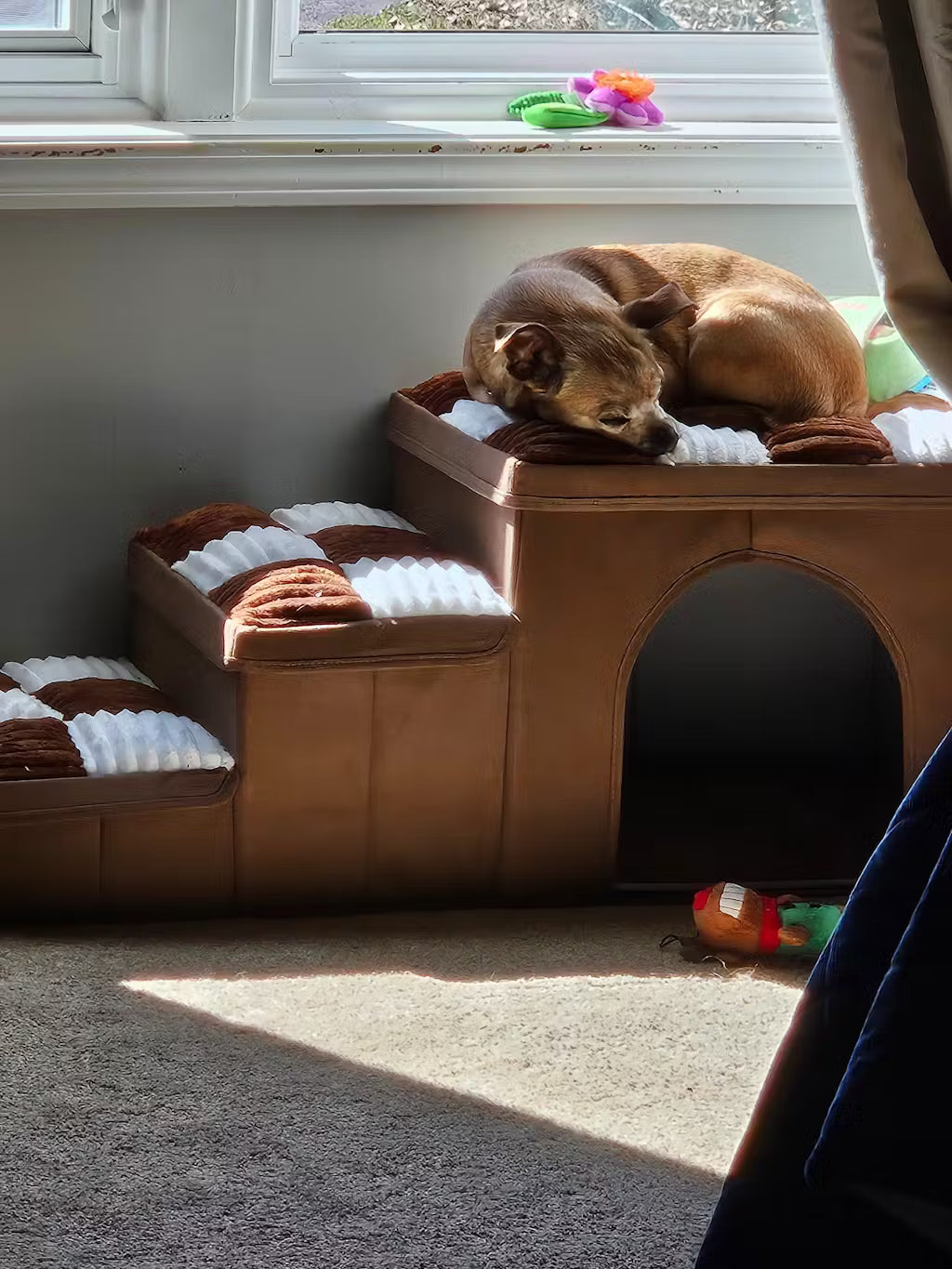 After a visiting dog consumed the first set of stairs she used for years, she suffered through a substandard set that got her up to the window, but made keeping watch less comfy and the journey down hard on her aging body. Enter the FunnyFuzzy Condo stairs! Leia has room to nap (see photo) in sunshine and an easy way up AND down. Space to stash toys or treats is a bonus - as is the space to curl up, should she need an escape from her adoring subjects...er, family.