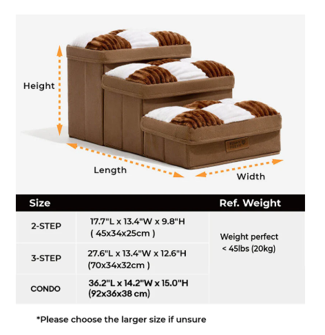 Dog Stairs for Bed & Sofa – Handcrafted Foldable Plaid Pet Steps with Storage, Non-Slip Design — Size Chart