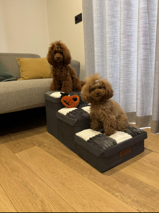 This is perfect for the safety of our little dogs who like to jump around and also provide extra storage for their things. We got this after our little naughty Mochi jumped off the sofa too many times and hurt her spine.