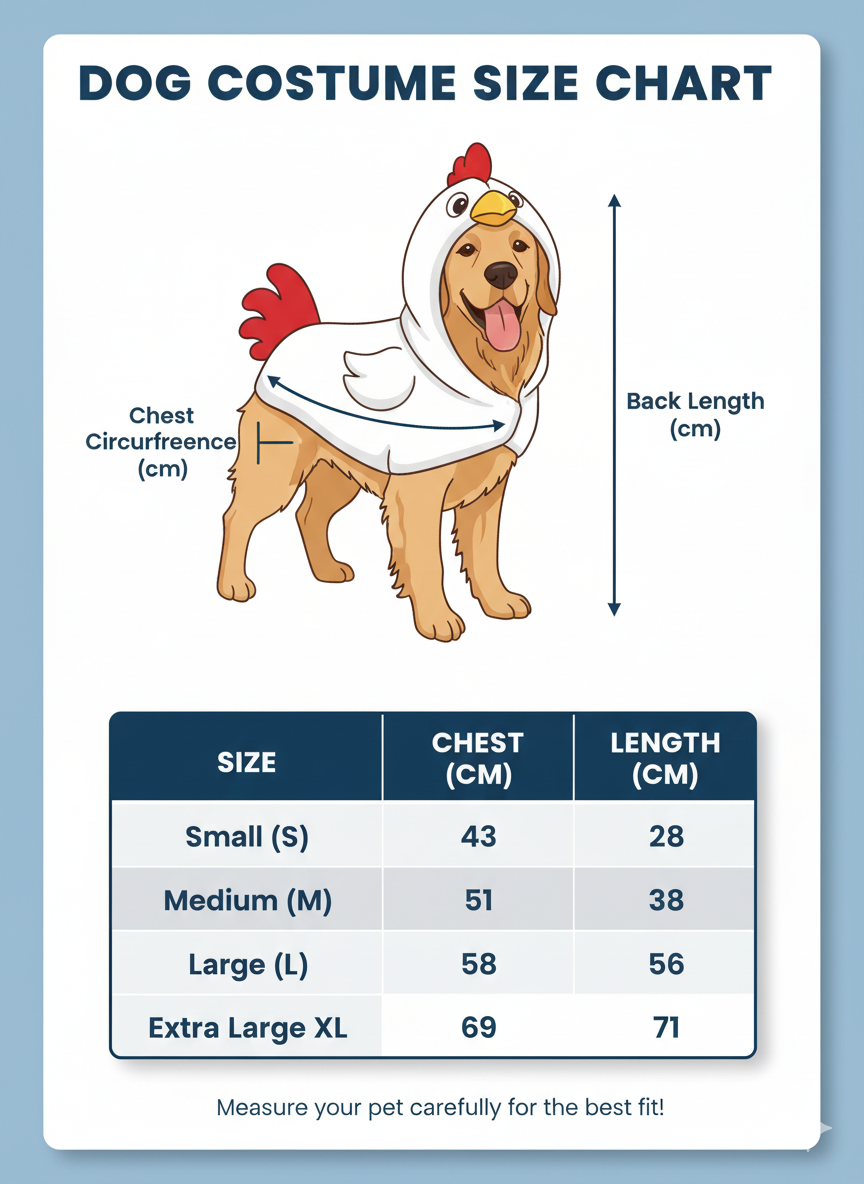 Fluffy Chicken Dog Costume – Pet Outfit with Feathered Hood — Size Chart