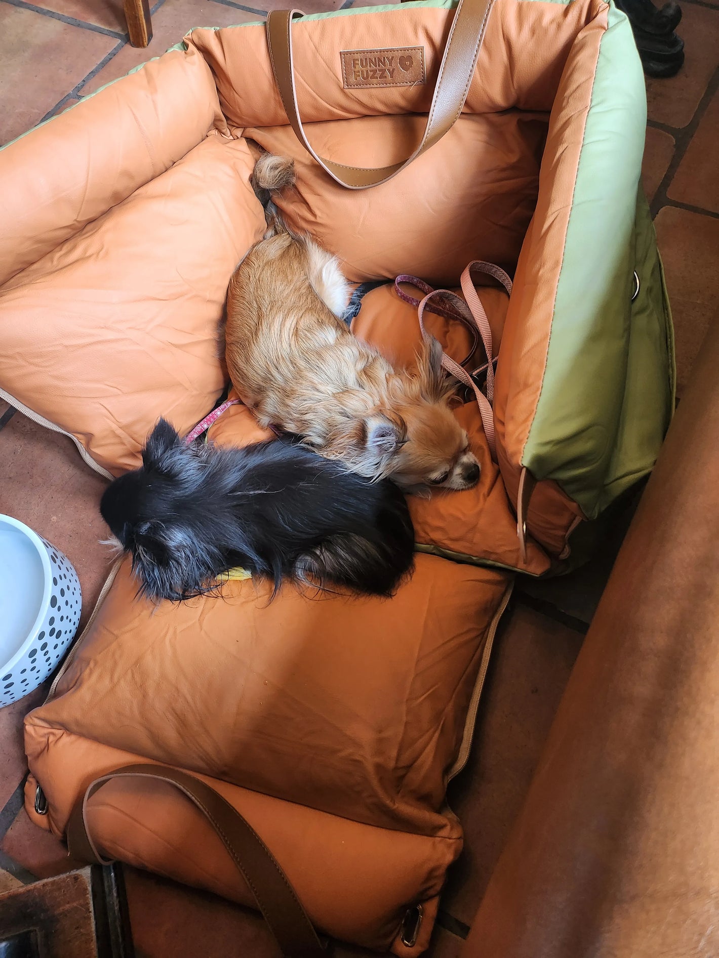 My two chihuahuas fit in this together. It's great for transporting them in the car or for carrying them. We also take it out with us if we go out to eat as we can open it up for them to snooze in when we go out (photo in a local pub). Great quality and quite light and easy to carry, it also looks great.