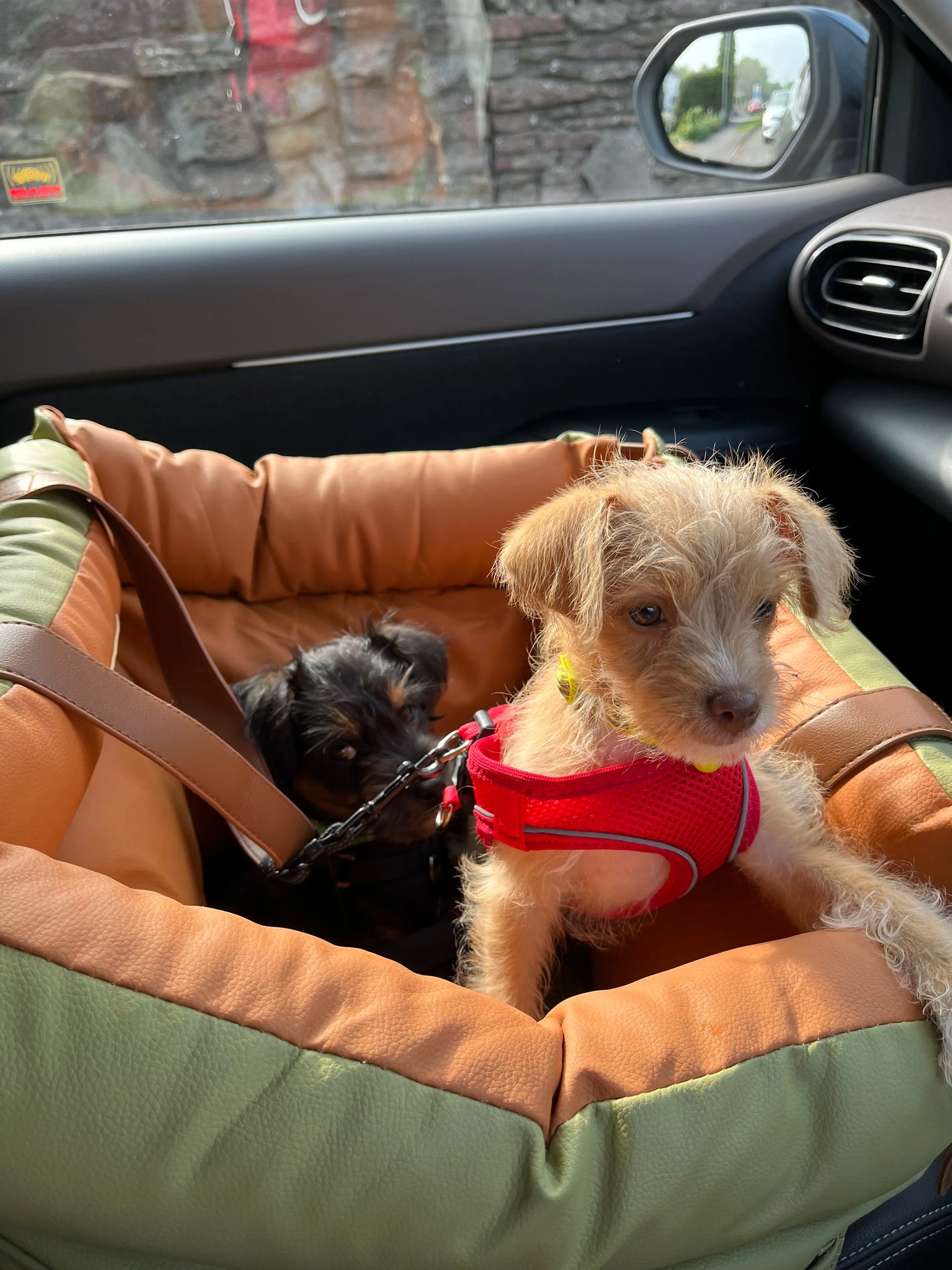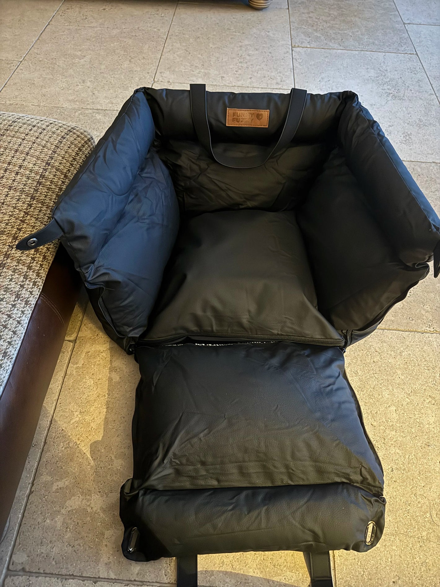 Lovely car seat . I bought the deluxe small faux black leather . Once inner cushions were in place and all zipped up I was pleasantly surprised! I think both my mini Daschunds should fit in once I get a small dual lead There is one lead in the seat and the seat came with a lovely strong detachable belt that you put over the headrests to secure the seat . Looks good to wipe down .. now to get my pup to travel in it and get used to the car and not be sick 😬 If you are looking for a secure seat for your furbies, then this is it !