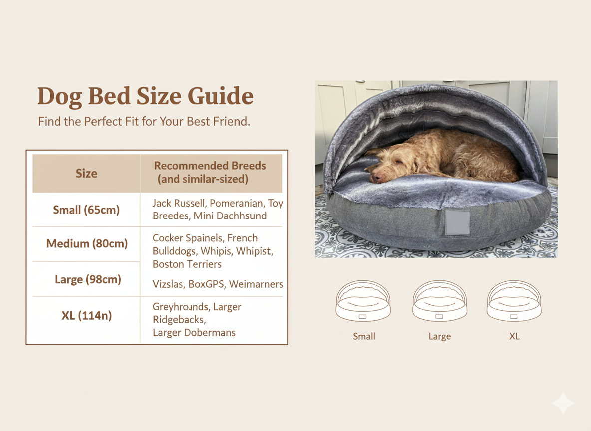 Dog Cave Bed – Grey Luxury Covered Calming Sofa with Removable Hood & Washable Cover — Size Chart