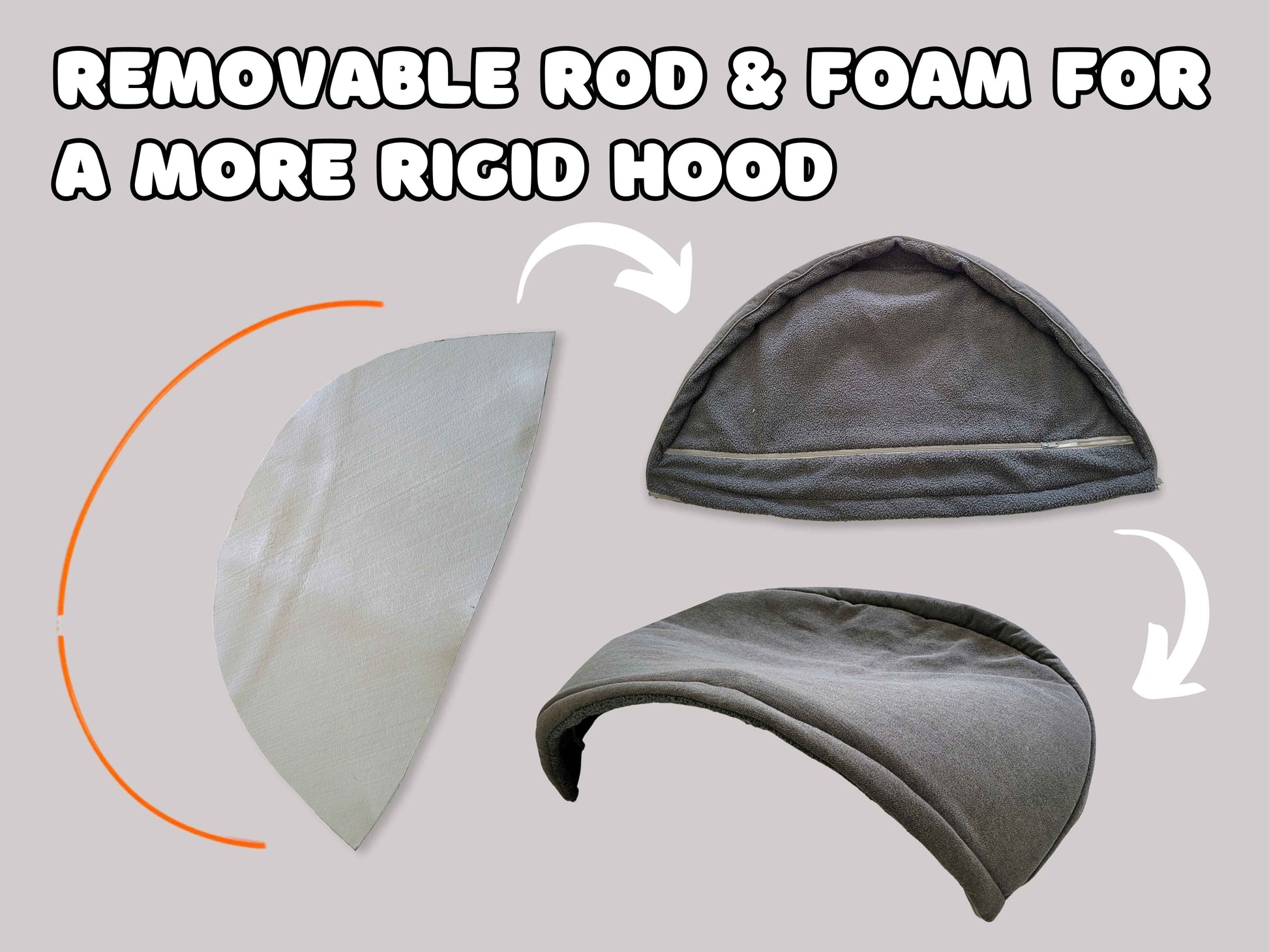 Crafted from upholstery-grade grey fabric and lined with soft faux fur, it creates a calming cocoon for restful sleep. The reinforced hood features a removable foam insert and flexible rod, providing a structured opening that stays in place for easy entry. In warmer months, the hood can be unzipped and removed to transform the cave into an open flat bed.
