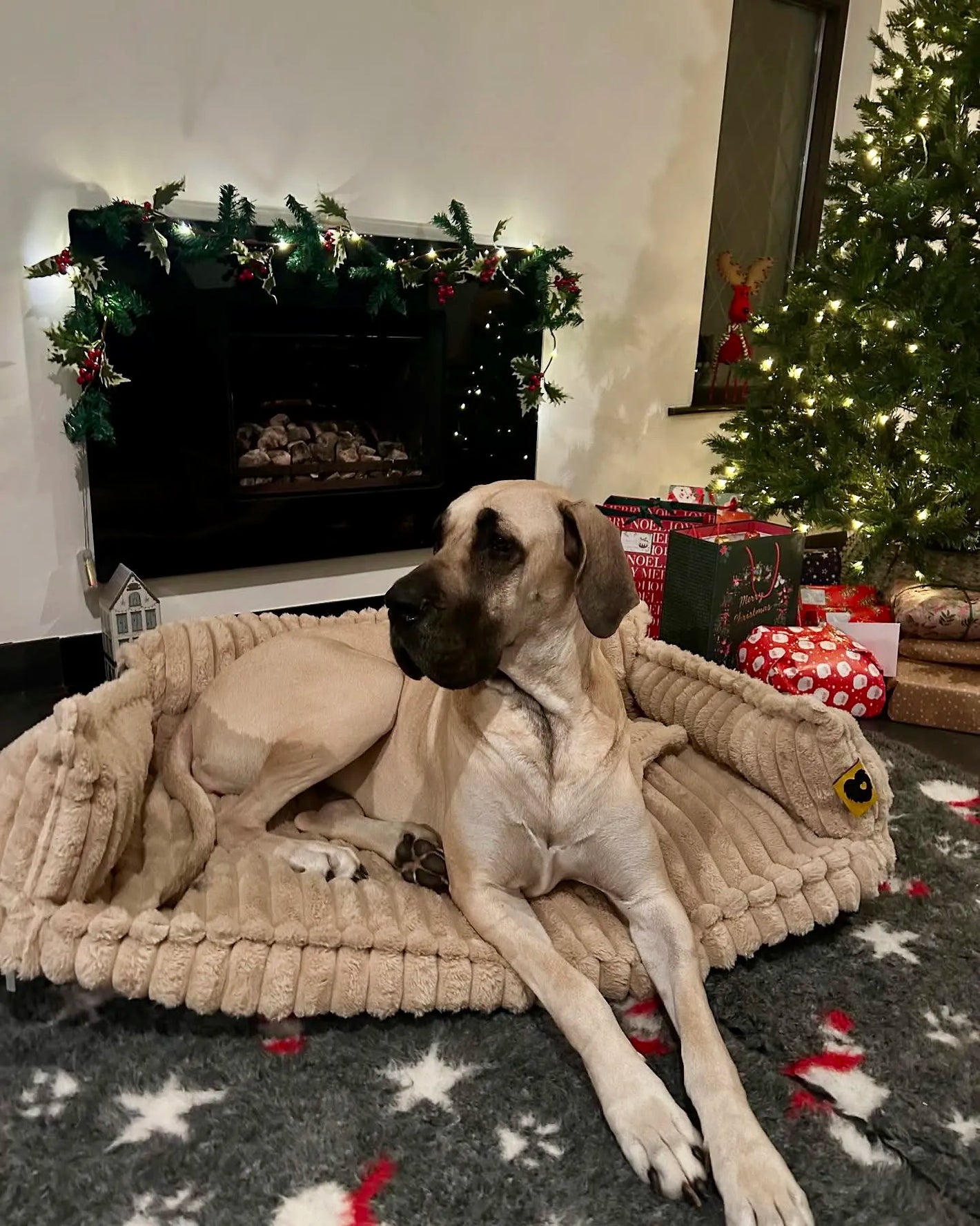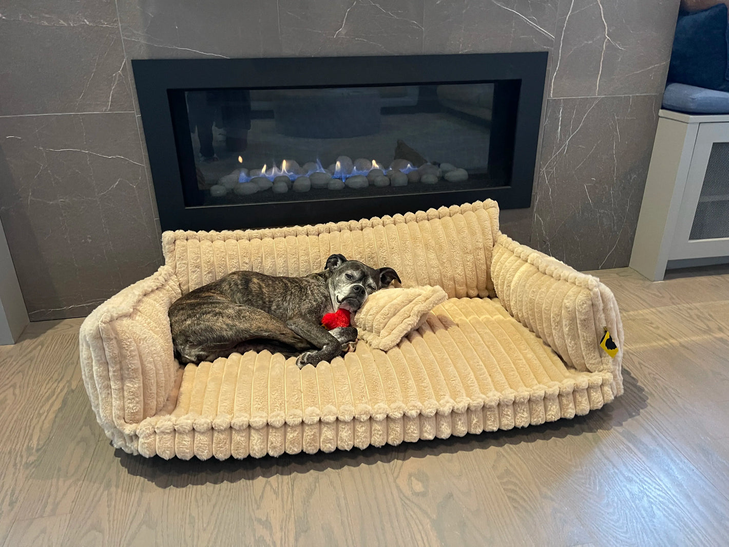 Designed with two armrests and pillow to support dog's neck to relax while lying on their side with legs extended.