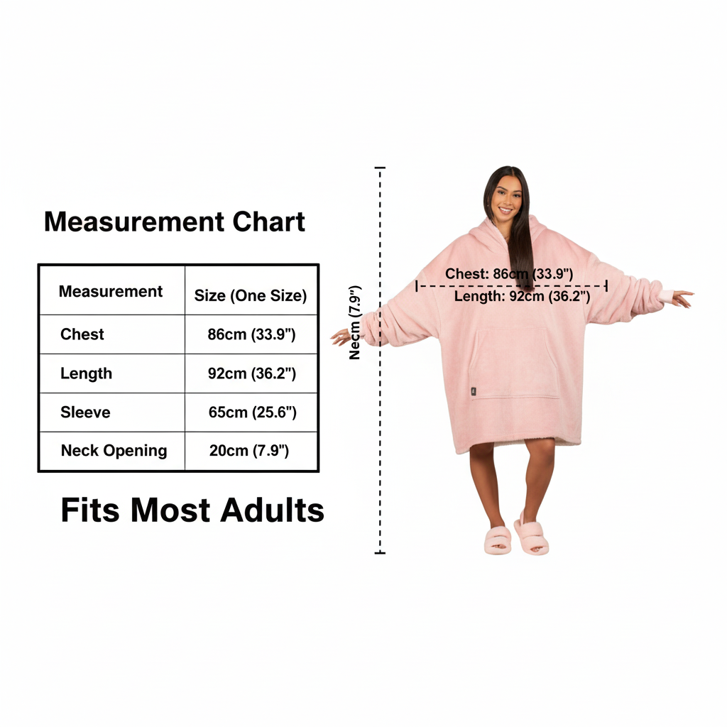 Electric Heated Hoodie Blanket – Adults Oversized, Blush Sherpa, USB Heated Wearable Throw, 3 Heat Settings — Size Chart