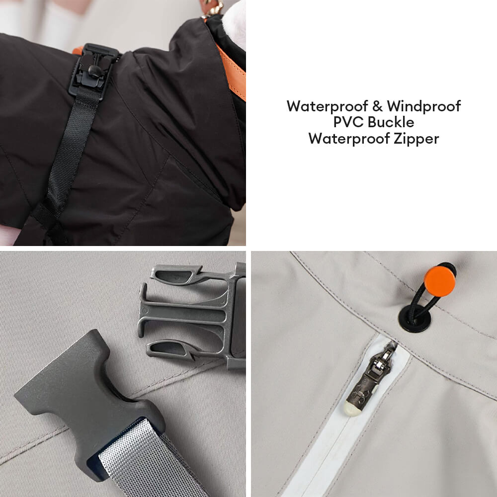 - Adjustable Turtleneck Raincoat:This raincoat features a high, adjustable collar to block wind and rain, with seamless stitching and a reinforced zipper for enhanced durability and comfort. Perfect for any weather, keeping your dog protected and stylish.