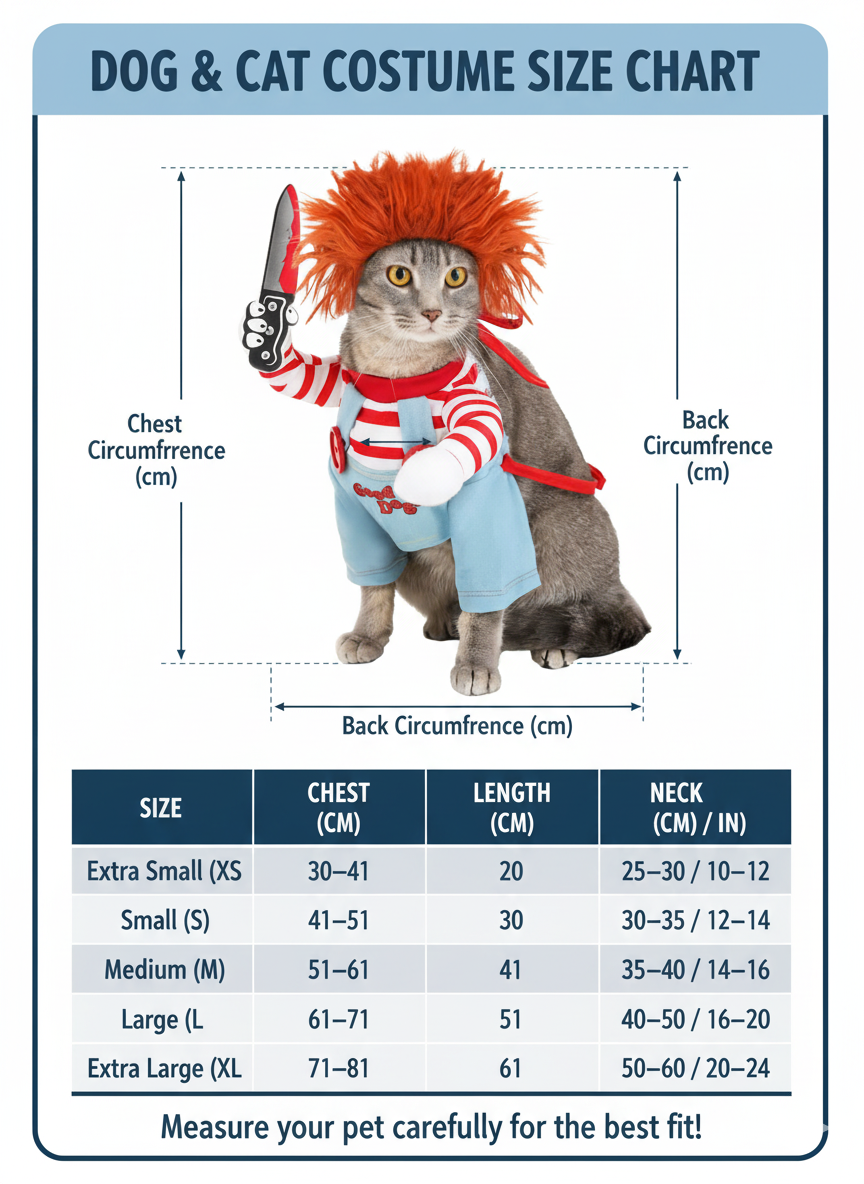 Deadly Doll Dog Costume – Halloween Pet Outfit with Foam Accessory — Size Chart