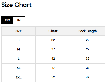 2XL: Chest 52 cm / 20.5 in; Back Length 42 cm / 16.5 in