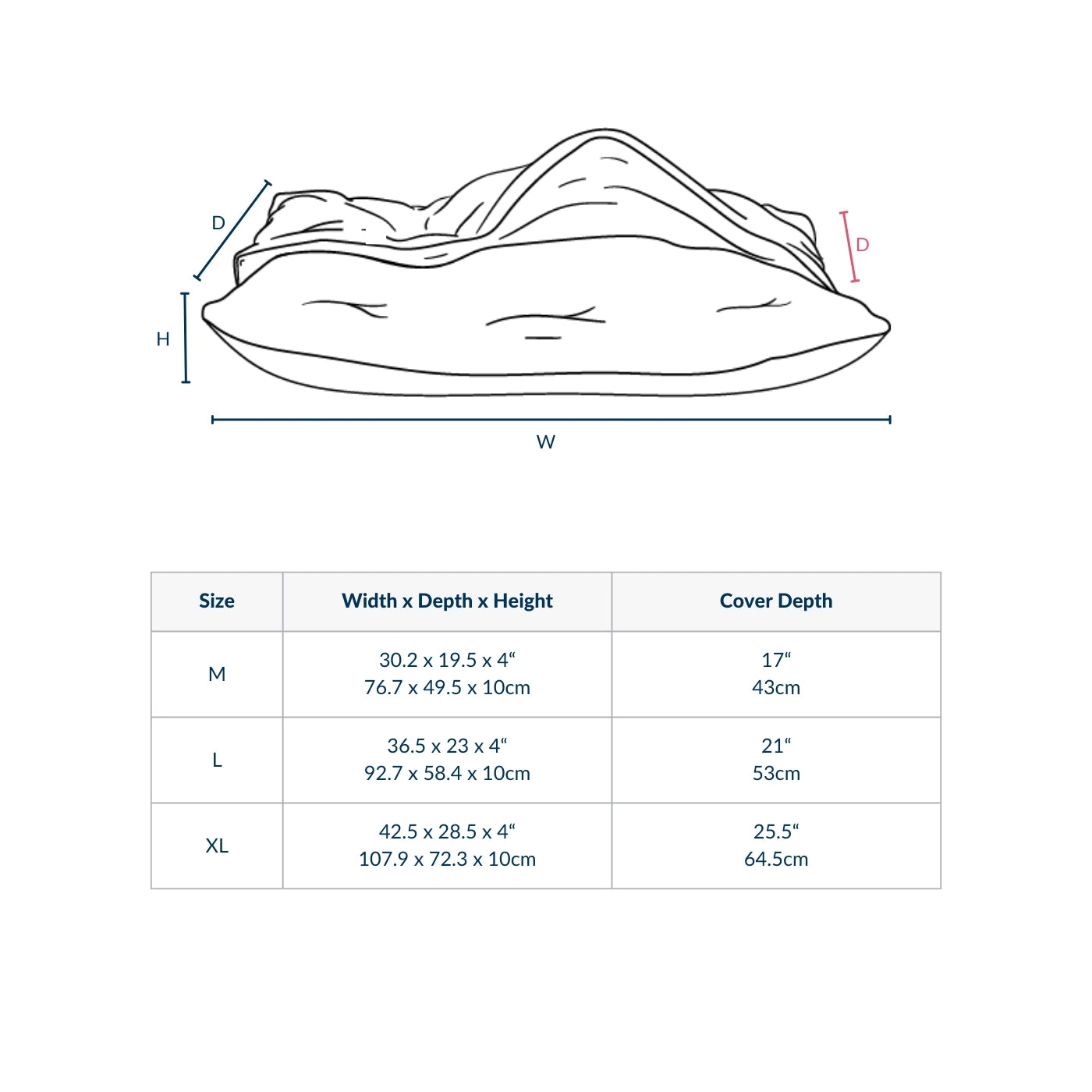 XL (42.5 × 28.5 × 4 in / 107.9 × 72.3 × 10 cm) – Cover depth 25.5" (64.5 cm)