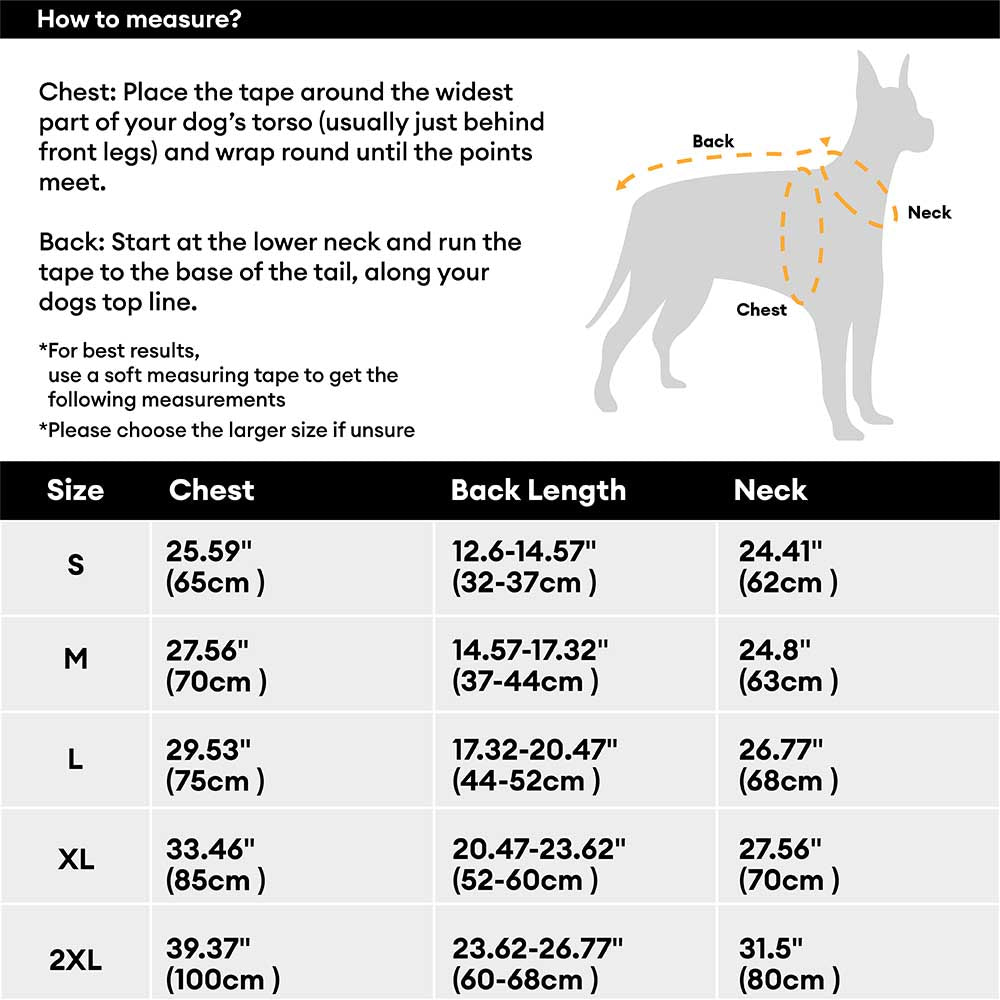 L: Chest: 75 cm / 29.53 in; Back Length: 44-52 cm / 17.32-20.47 in; Neck: 68 cm / 26.77 in; Suggested Weight: 33-66 lbs